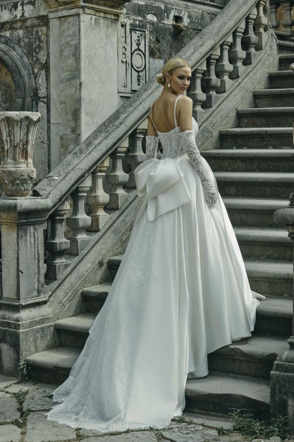 Entrando nel dettaglio la parte superiore dell’abito è caratterizzata da un corpino steccato con effetto modellante, leggermente a vita bassa e con una punta sul davanti, interamente realizzato in pizzo ricamato. La scollatura a sorriso dona un tocco di dolcezza e romanticismo.