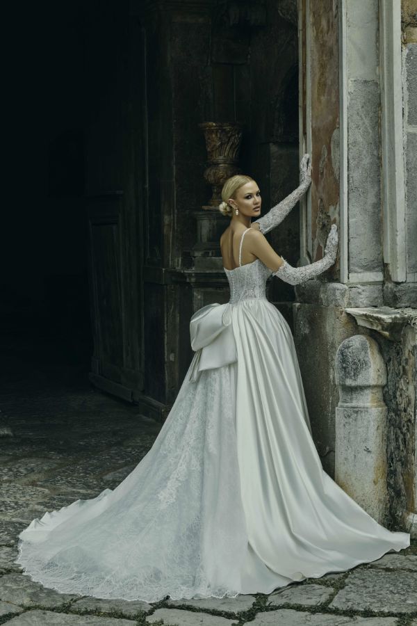 Realizzato con una gonna ampia arricciata in duchesse dal colore caldo, questo abito presenta un maestoso fiocco sul retro che sovrasta una cascata di pizzo. Il pizzo rebrodè ricamato con cristalli e Swarovski adorna sia la gonna che il corpetto.