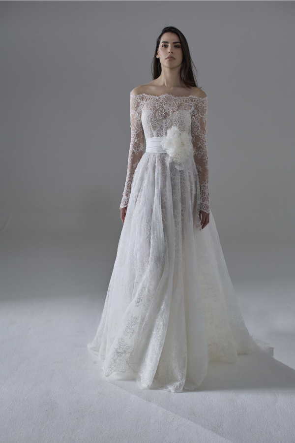 - abito in pizzo con cintura di organza per evidenziare il punto vita