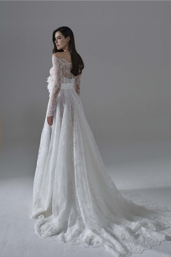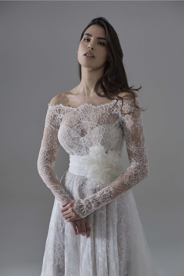 La gonna ampia in pizzo rebrodè cade morbida e romantica, mentre il tocco distintivo è dato dal bolerino removibile in pizzo coordinato, con scollatura a barca e maniche lunghe, che aggiunge versatilità e un’allure regale.
