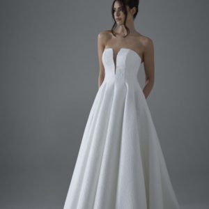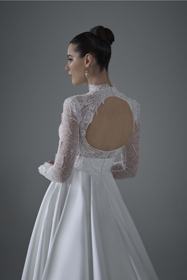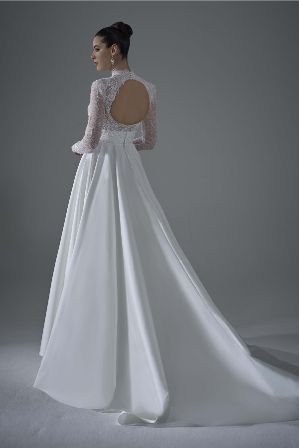 La vita è segnata da una cintura alta in mikado, che slancia e armonizza le proporzioni. Da qui si apre un’ampia gonna liscia in mikado di seta, morbida e strutturata allo stesso tempo, con un leggero strascico che aggiunge maestosità e grazia. Il retro con oblò completa la silhouette con un dettaglio sensuale e raffinato, perfetto per sorprendere e incantare.