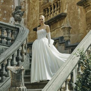 La parte superiore dell’abito è caratterizzata da un corpino steccato con effetto modellante. Le coppe interne supportano il décolleté, garantendo comfort e sostegno per tutta la giornata. Lo scollo off-shoulder lascia le spalle scoperte, conferendo un’aura di eleganza e raffinatezza, emanata anche nelle maniche lunghe in pizzo che donano un senso di continuità e coerenza nel design. Il retro dell’abito è altrettanto elegante, con uno scollo off-shoulder, assicurando una perfetta tenuta del capo. Le tecniche di lavorazione artigianale utilizzate per il pizzo francese con microricamo garantiscono un tocco luminoso e leggero, per una luce immensa che accompagnerà ogni movimento della sposa.