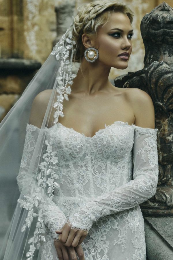 Lo scollo off-shoulder lascia le spalle scoperte, conferendo un’aura di eleganza e raffinatezza, emanata anche nelle maniche lunghe in pizzo che donano un senso di continuità e coerenza nel design.