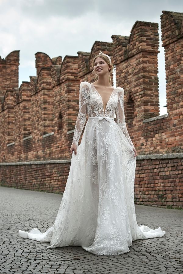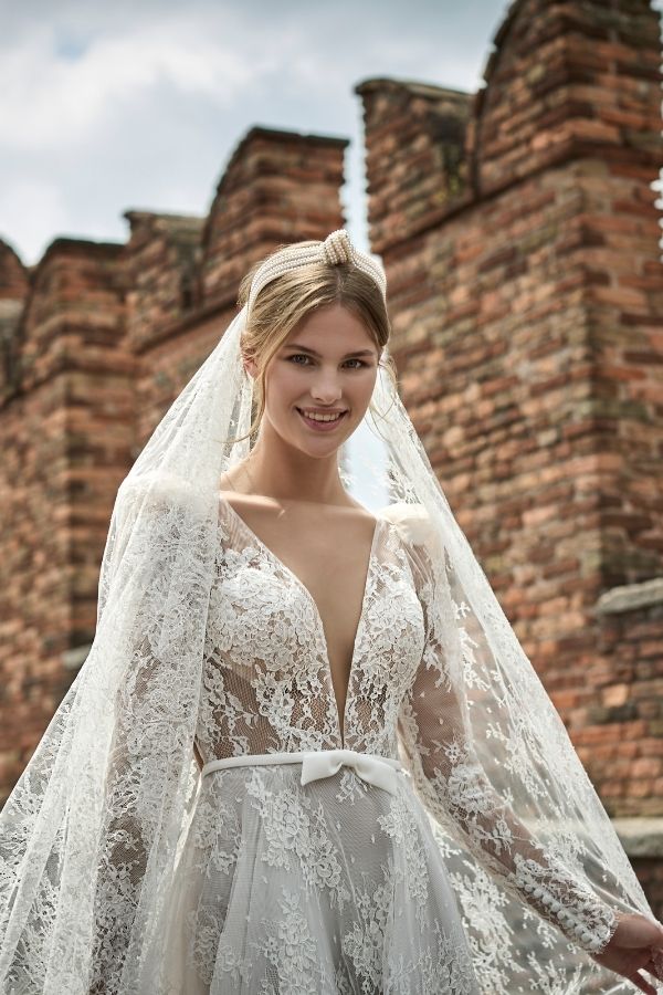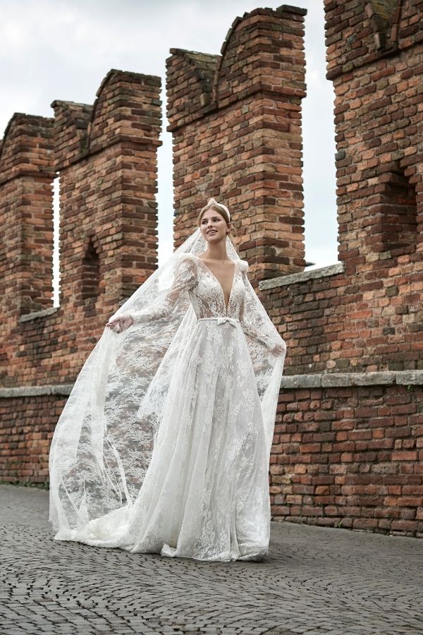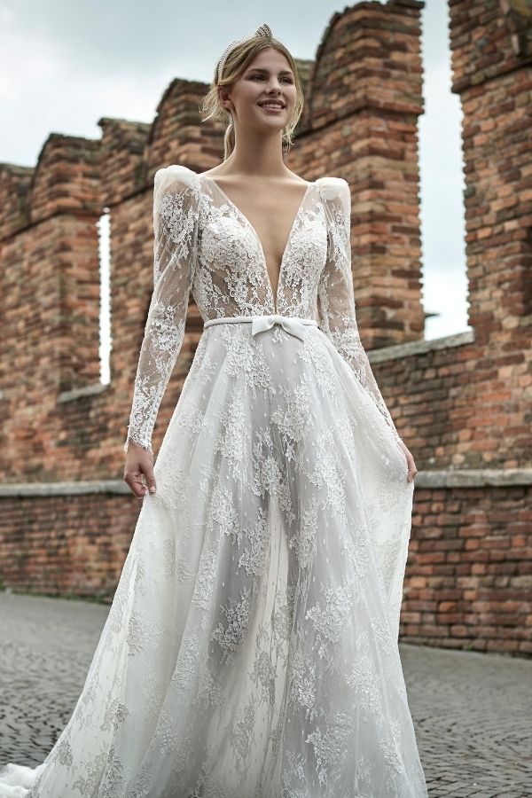 La parte superiore dell’abito presenta un profondo scollo a V in pizzo rebrodè, con un corpino steccato che offre sostegno grazie alle coppe sagomate. Le maniche con spalline sono a sbuffo in pizzo rebrodè.