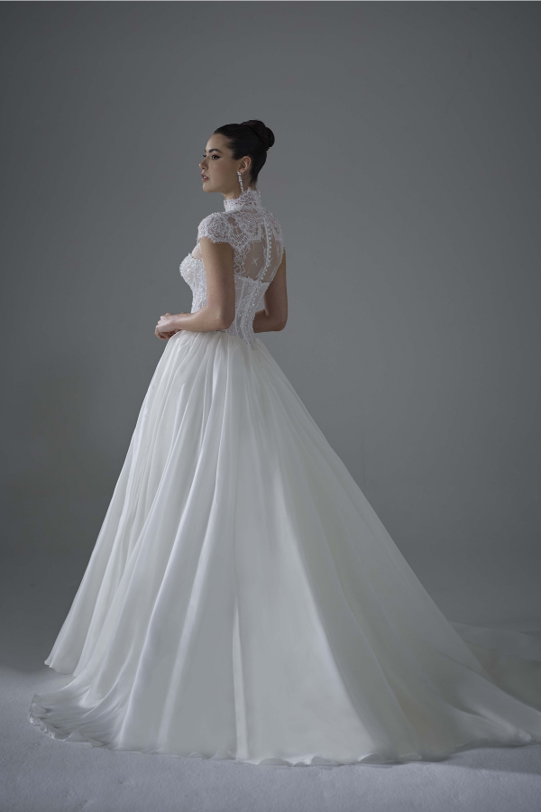 Il retro dell’abito segue la linea con discrezione, lasciando spazio alla personalizzazione della parte superiore: la sposa può scegliere di indossarlo con un bolerino in pizzo coordinato, che riprende il disegno a goccia dello scollo anteriore oppure optare per manicotti in pizzo per completare il look.