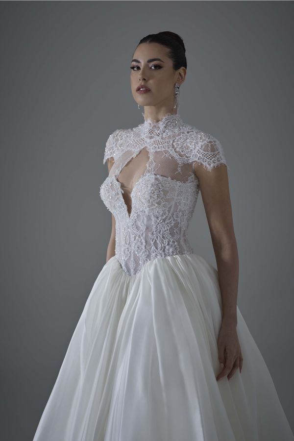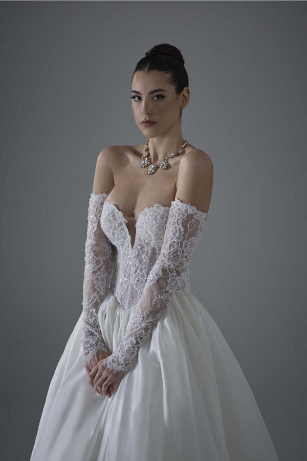 Bellatrix è un abito a principessa dalla struttura importante e al tempo stesso equilibrata in ogni dettaglio. Il suo corpino a punta, realizzato in pizzo ricamato con micro cristalli e canottiglie, esalta la parte superiore con eleganza e crea un effetto luminoso, sofisticato e scenografico. Lo scollo a cuore profondo è pensato per valorizzare il décolleté mentre la vita a punta contribuisce a slanciare la figura e donare verticalità.