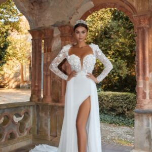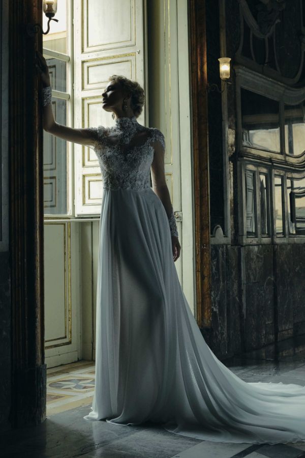 L’abito da sposa Berillo della collezione Isabella è un sogno d’amore per ogni sposa. Questo modello scivolato, con un corpino effetto tattoo, combina la leggerezza dello chiffon alla luminosità del pizzo ricamato.