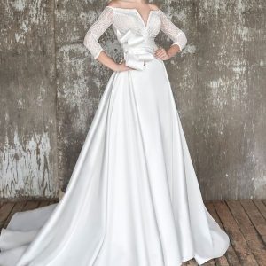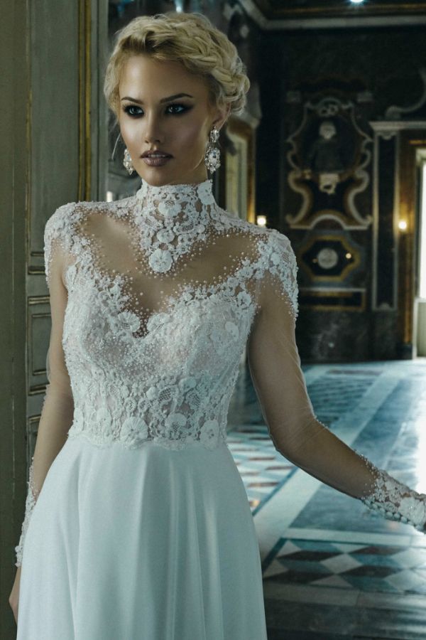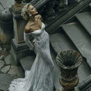 Realizzato con pizzo ricamato francese, il capo si distingue per il suo corpino steccato e modellante. Grazie al tulle illusion, il pizzo crea un effetto collo alto, mentre le maniche lunghe in pizzo con illusion tattoo donano quell’eleganza intramontabile.