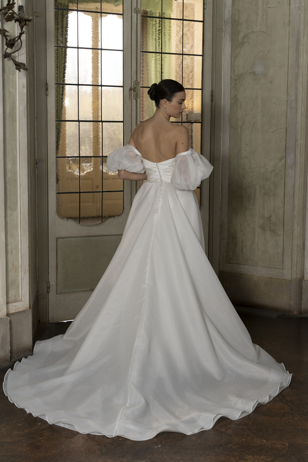 Lo scollo sul retro è leggermente a punta, completato da una fila di bottoncini lungo la chiusura. Le maniche a sbuffo effetto balloon, staccabili in chiffon, offrono la possibilità di un doppio look, versatile e affascinante come la città di Bogotà stessa.
