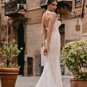 Sul retro, l’abito presenta un profondo scollo a V con tulle illusion, accentuato da una fila di delicati bottoncini che completano il look.