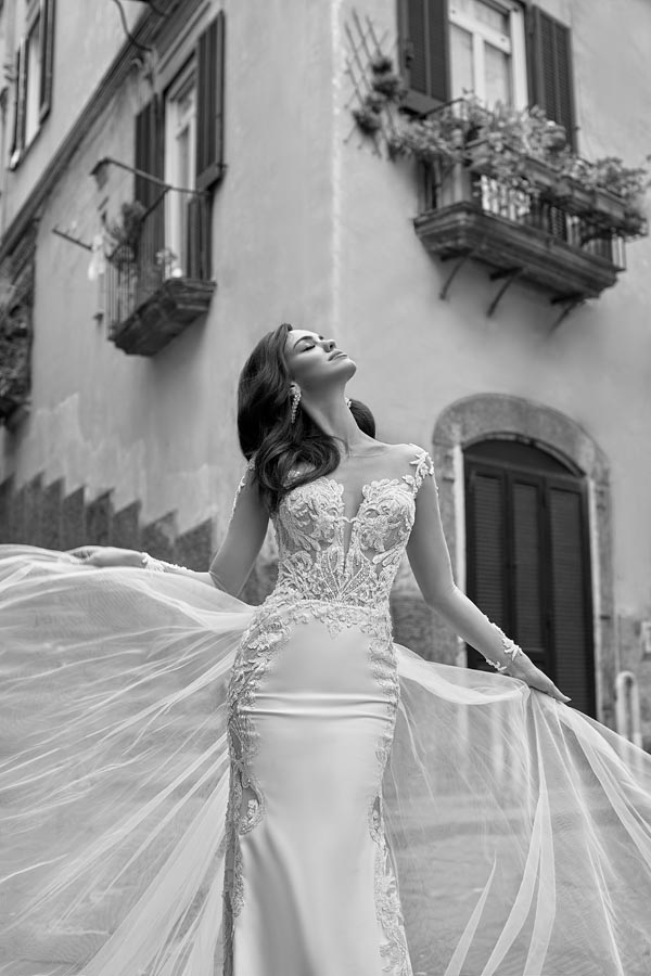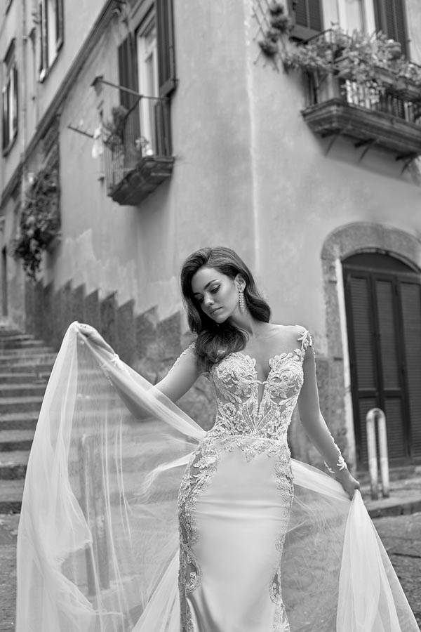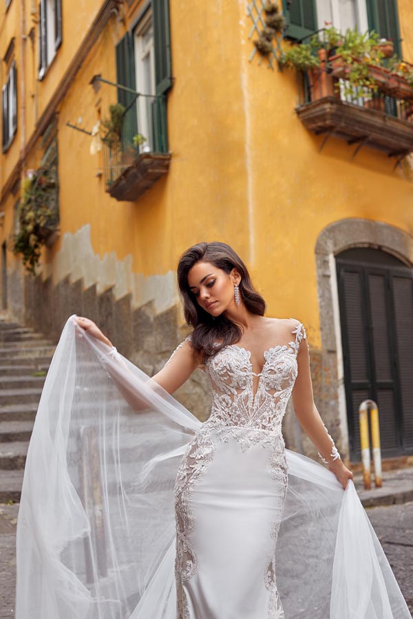 La gonna a sirena, realizzata in crepe, avvolge le forme con grazia, mentre gli intarsi di pizzo ricamato sui fianchi aggiungono un seducente gioco di trasparenze, creando un effetto vedo non vedo che affascina e conquista.
