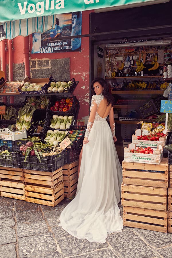 Il retro dell’abito è decorato in pizzo, con bottoncini lungo la chiusura che esaltano la schiena con eleganza.