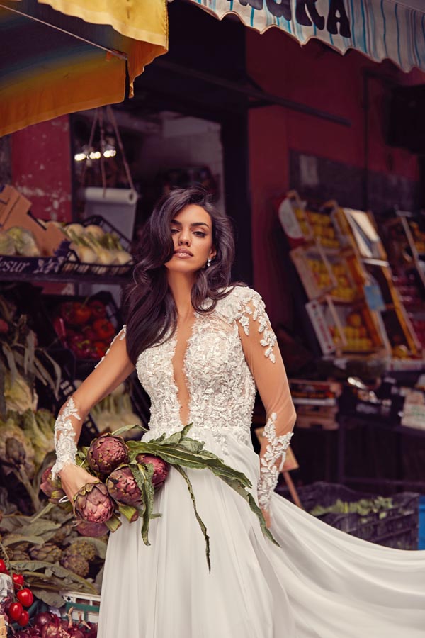 Il corpino steccato è realizzato in pizzo chantilly, impreziosito da ricami e applicazioni, e presenta maniche lunghe ricamate nello stesso pizzo. Il profondo scollo a V con tulle illusion ed effetto mezzo collo aggiunge una nota di sofisticata sensualità.