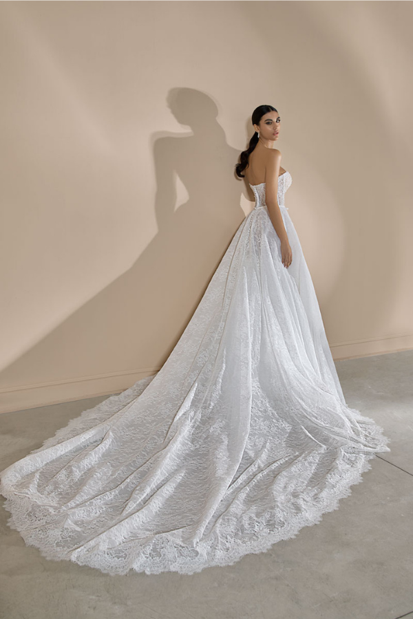 - Abito da sposa a principessa in pizzo con lunga coda;