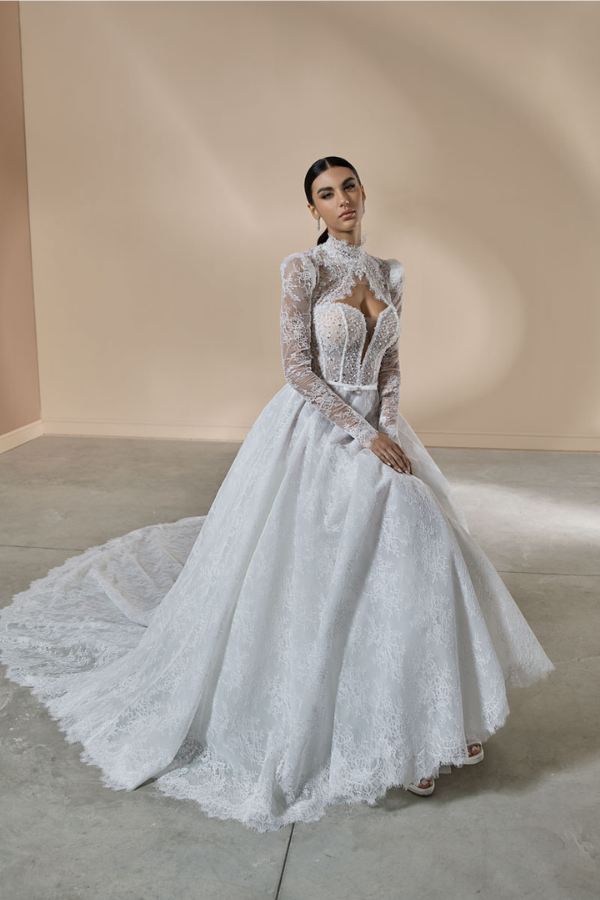 Il retro presenta una scollatura dritta, mantenendo un equilibrio armonico tra romanticismo e raffinatezza. A completare il look, un giacchino in pizzo chantilly con maniche a palloncino che incornicia la scollatura e consente alla sposa di giocare con due styling diversi nello stesso abito.