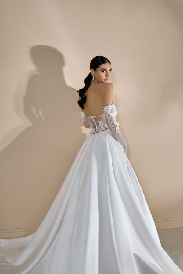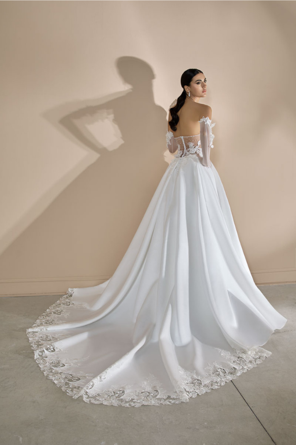 La gonna ampia con piegoni in duchesse si apre sul retro in una coda intagliata in pizzo, vero elemento distintivo dell’abito, che regala una scenografia ricercata ad ogni passo.