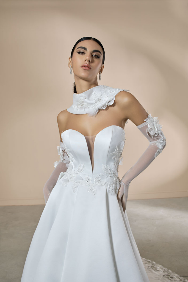 Completano il look accessori coordinati: un collo in raso duchesse che rievoca epoche passate e lunghi guanti in tulle con applicazioni in pizzo.