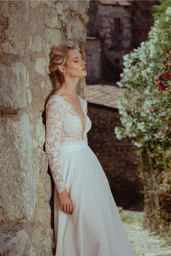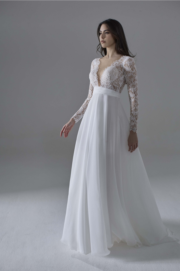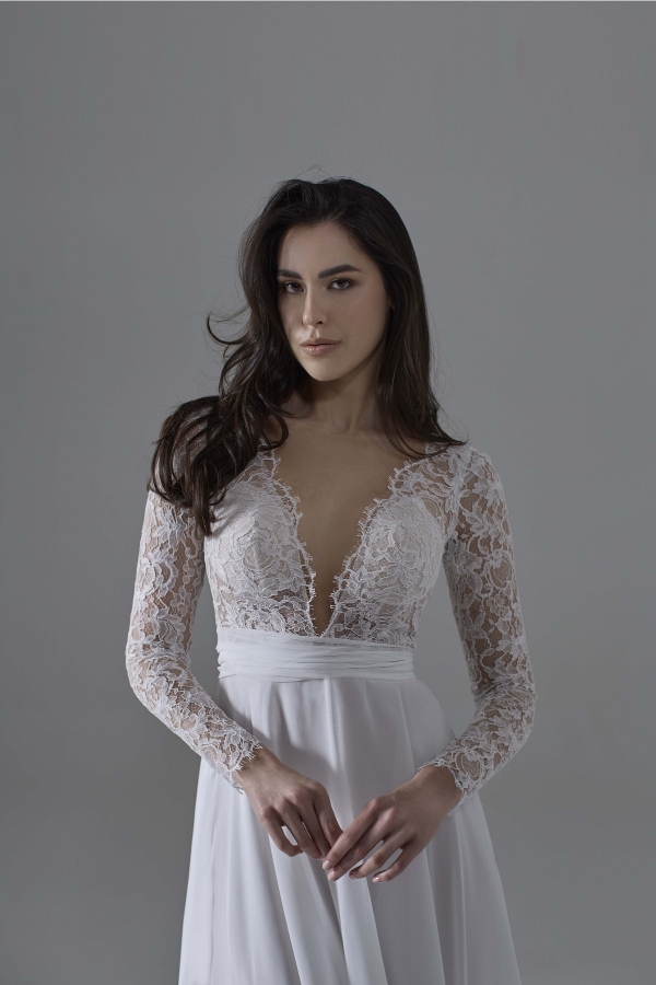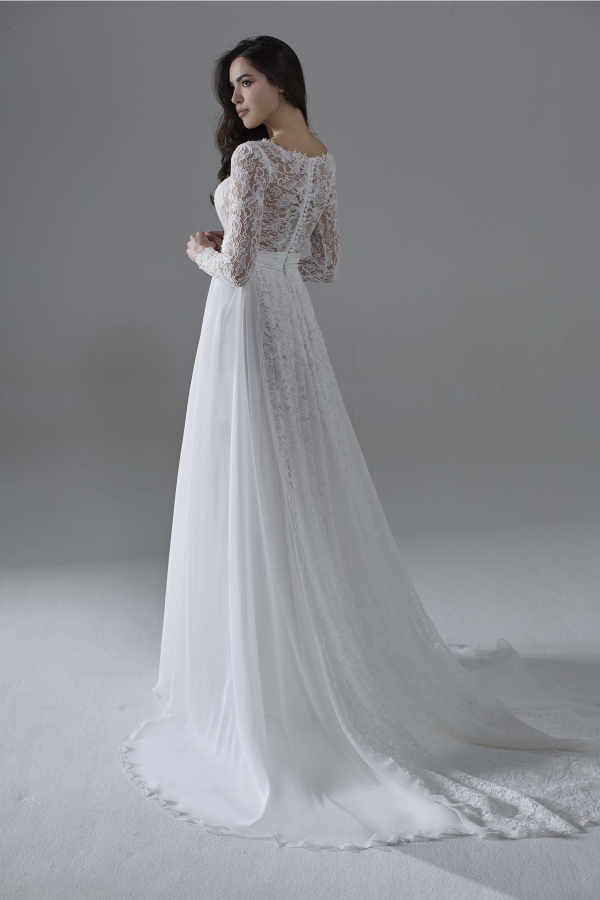 Le maniche lunghe, anch’esse in pizzo, donano un tocco di romanticismo mentre la gonna in chiffon leggerissimo cade morbidamente sul corpo seguendo i movimenti. Il fondo si apre in una coda eterea in pizzo, che riprende i motivi del bustino e regala all’abito un’eleganza senza tempo.