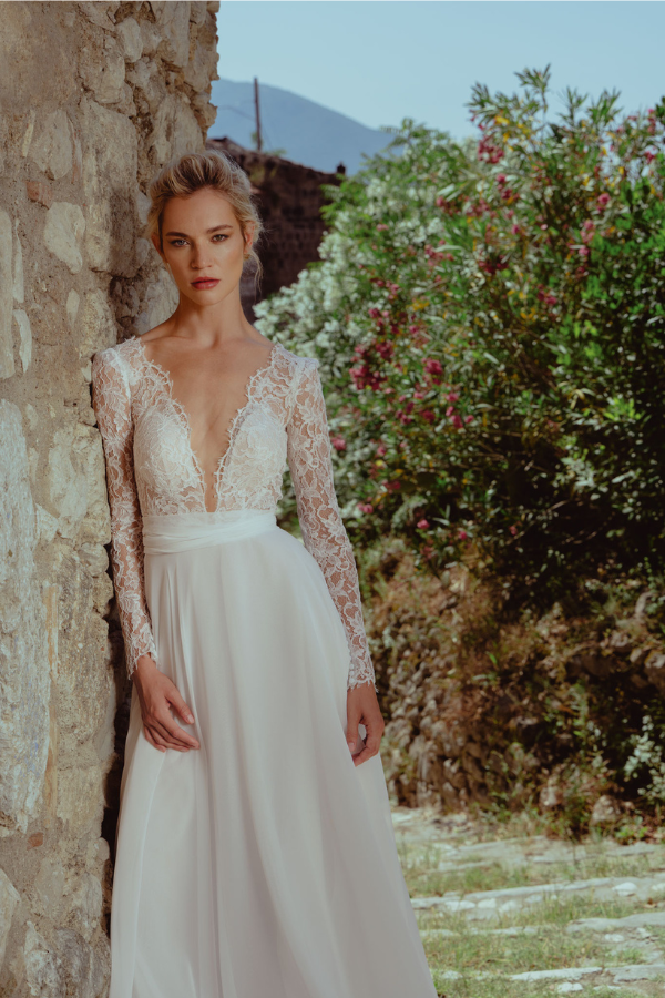 - Abito da sposa in chiffon con corpino e maniche di pizzo