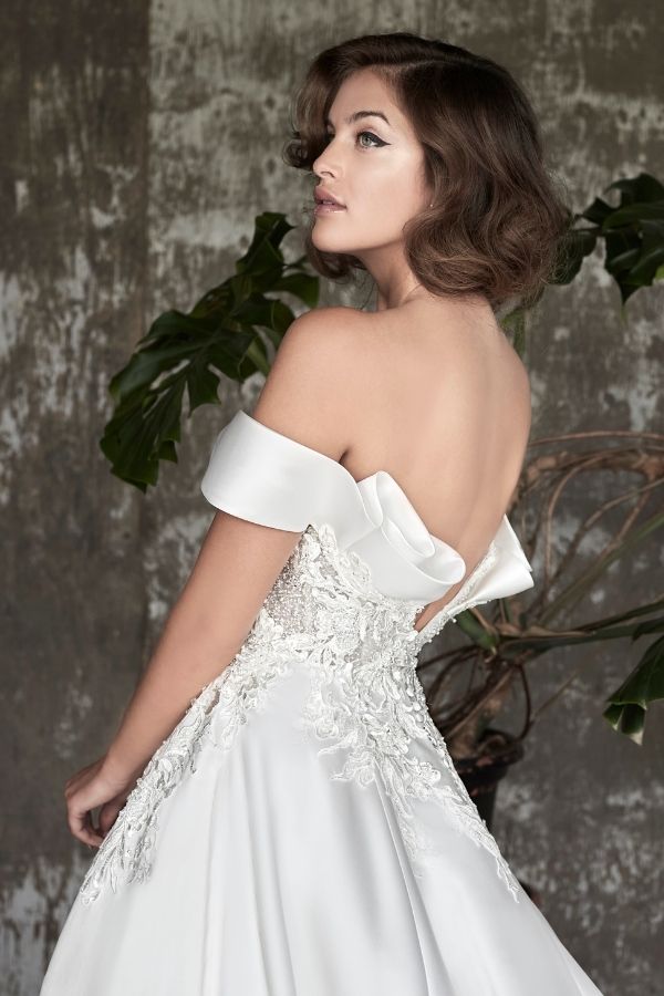 Realizzato in mikado di seta, presenta un corpino steccato con uno scollo omerale che si estende con grazia anche sul retro, arricchito da pizzo ricamato a mano e cristalli boreali che scintillano con ogni movimento, catturando la luce in un balletto di riflessi. Le coppe preformate con effetto di sostegno esaltano il décolleté.