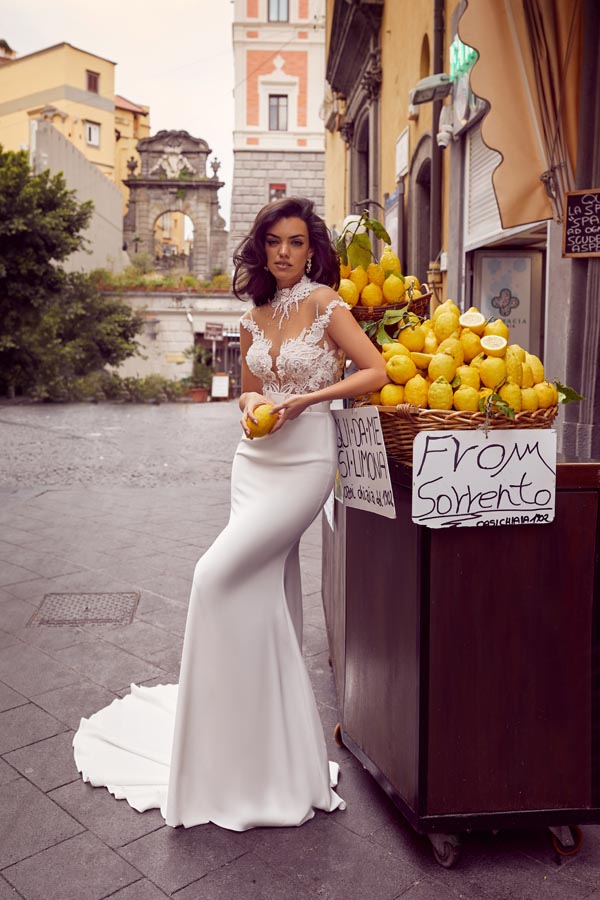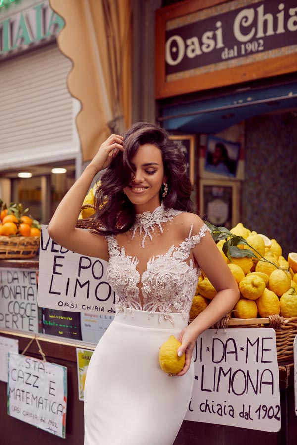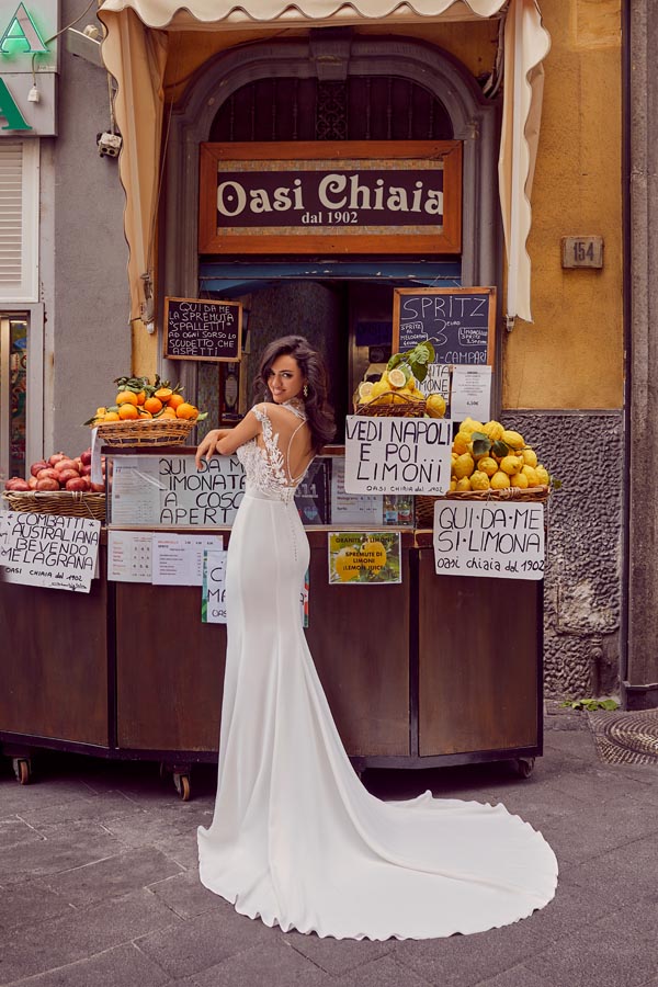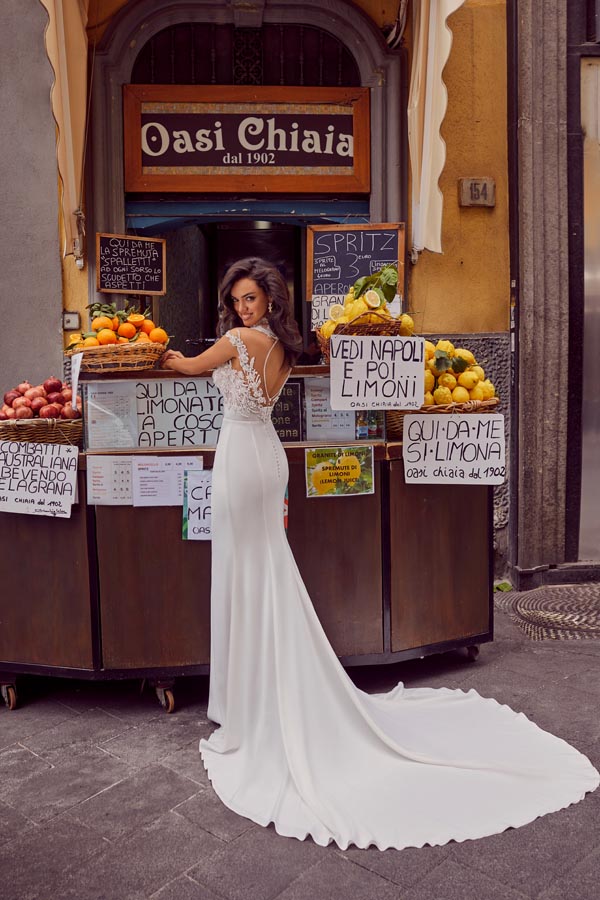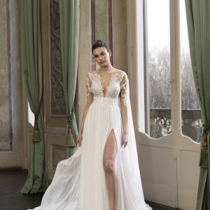 Kaia è ideale per tutte le stagioni e perfetto per matrimoni sia diurni che serali, adattandosi a fisicità mediterranee e longilinee.