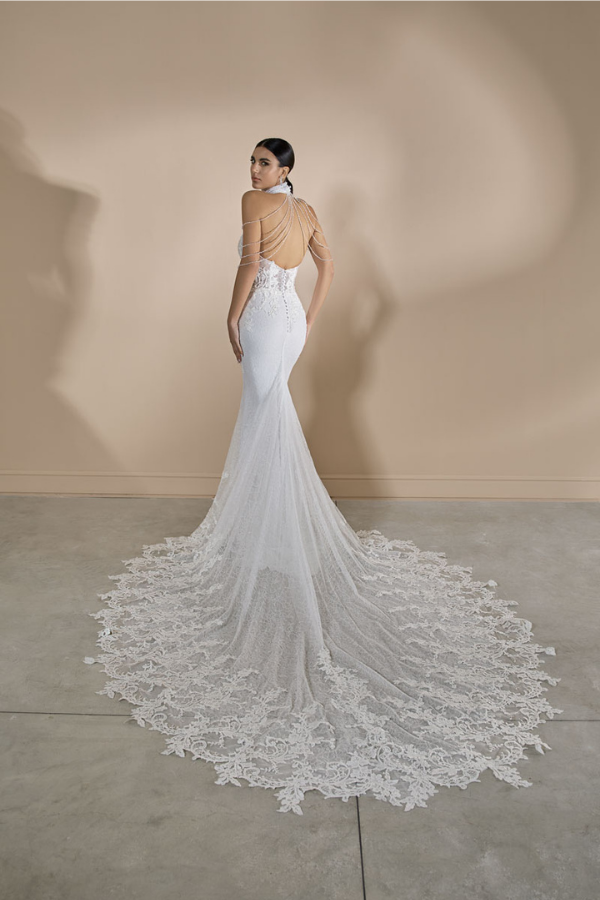 - Abito da sposa a sirena in pizzo con profondo scollo sulla schiena,