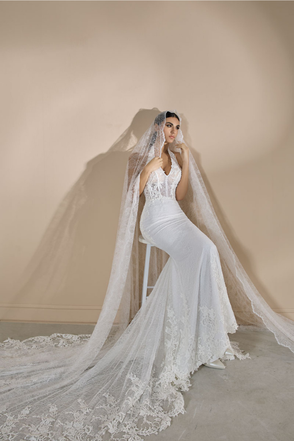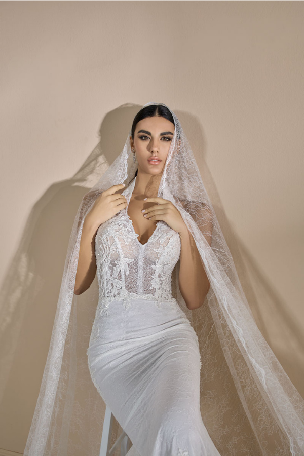 Il suo silenzio racconta tutto e ogni dettaglio è una dichiarazione: la scollatura profonda, la coda ricamata, il velo che si apre come ali. Indossarlo è un gesto fiero, quasi sacro. È libertà. È leggerezza. È forza che non ha bisogno di essere spiegata.