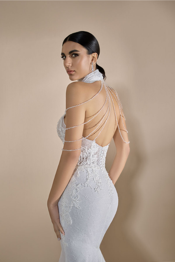 Lampedusa è un abito da sposa a sirena in pizzo chantilly ombra, con una linea leggera ma decisa. Il corpino presenta una profonda scollatura a goccia, arricchita da raffinate applicazioni in pizzo rebrodè e cristalli Swarovski. Lo scollo a oblò sul retro diventa protagonista con un motivo a collana di perle che avvolge le spalle e valorizza la schiena.