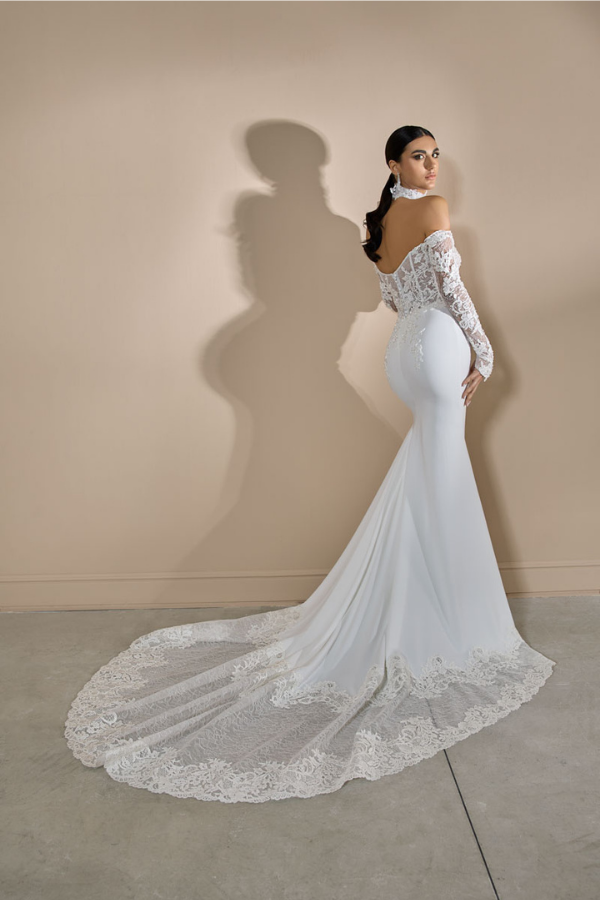 - Abito da sposa a sirena con scollo omerale e collaretta in pizzo.