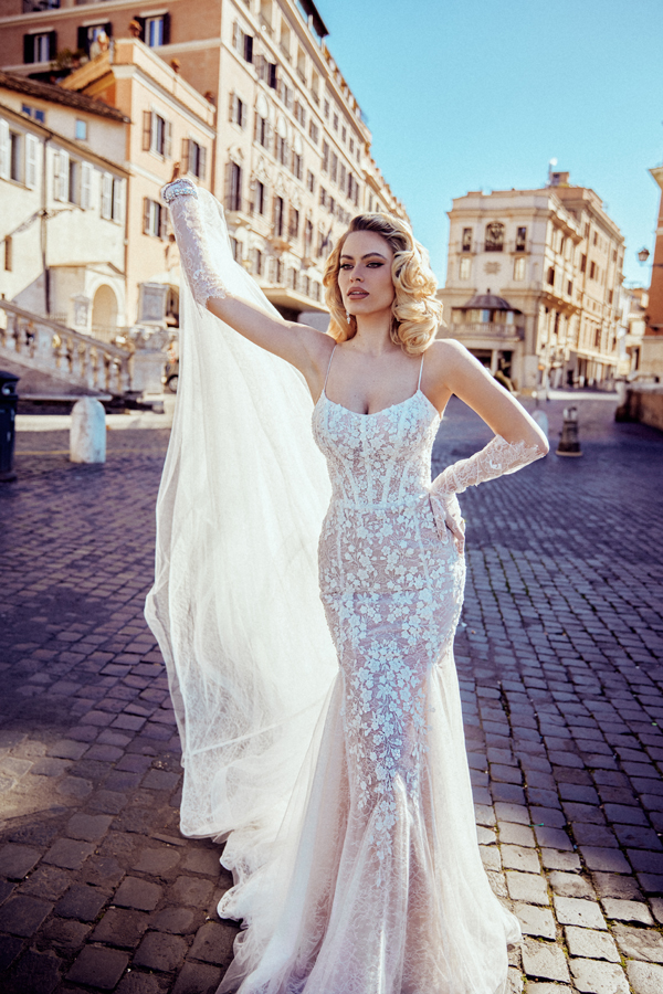 Mara è una straordinaria creazione a sirena, interamente realizzata in pizzo chantilly shimmer con dettagli unici che esaltano la sinuosità della silhouette.