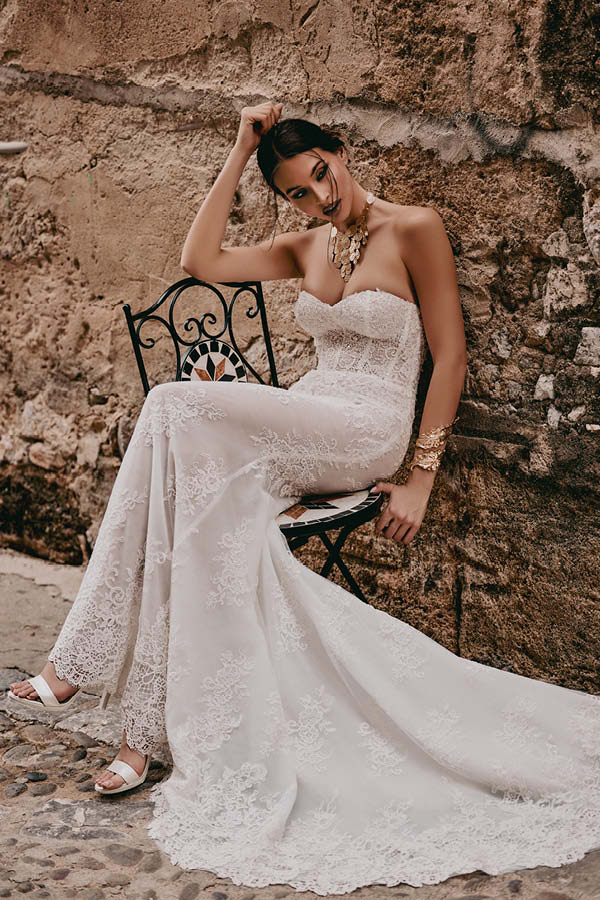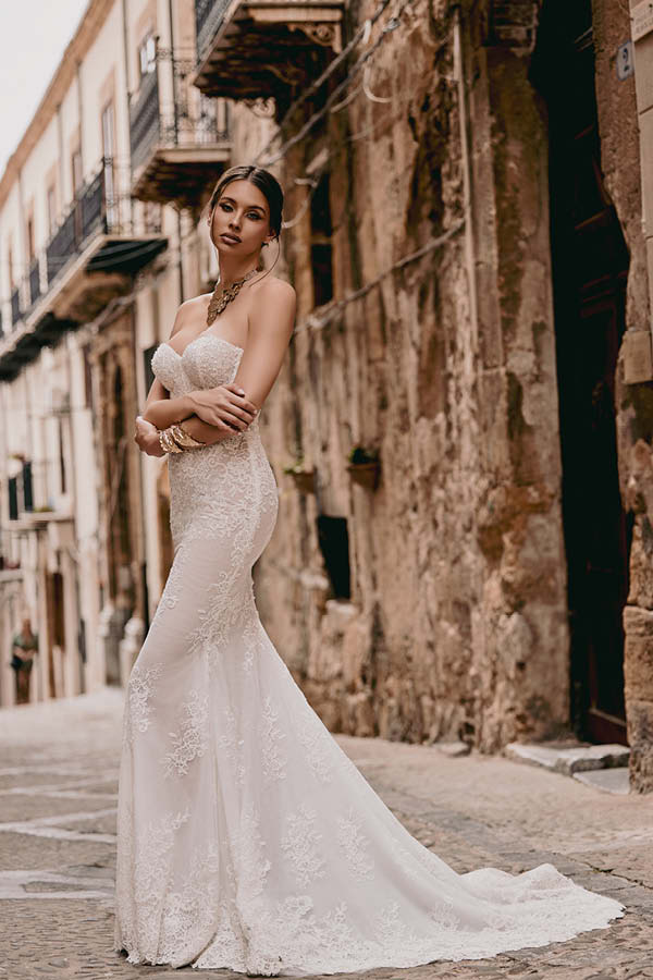 - abito da sposa a sirena in pizzo con schiena scoperta.