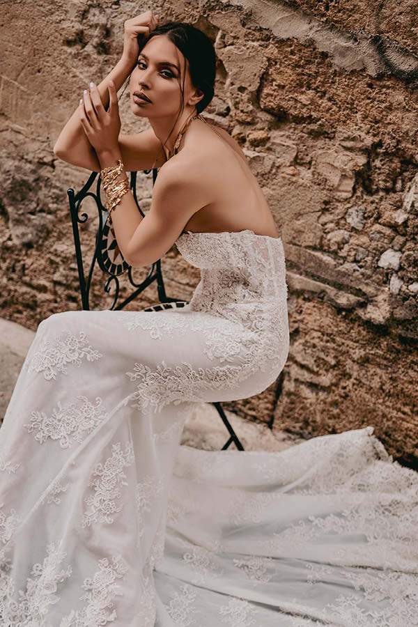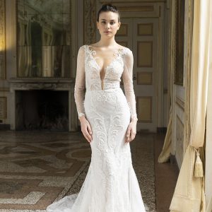 Il suo punto di forza? Il sovracoda removibile che permette di trasformare l’abito da una sensuale sirena a una romantica principessa all’ingresso dell’altare.
