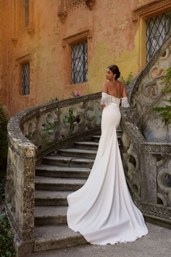 L’abito Margarita di Maison Signore è una celebrazione della sensualità, eleganza e determinazione, perfetto per la sposa che desidera distinguersi. Le fantastiche alette in cristallo removibili con frange gioiello conferiscono al capo un’unicità e un’eleganza ineguagliabili, ispirate all’icona moderna Blake Lively e alla storica Audrey Hepburn.