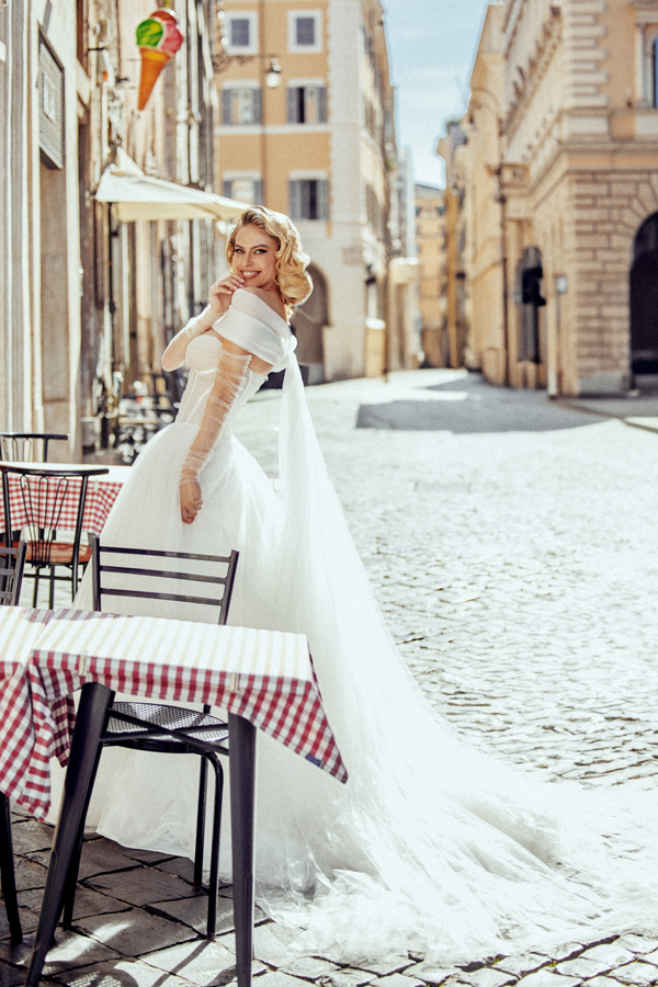 Dal retro nasce un mezzo fiocco semirigido con due lunghe calate in leggerissimo tulle.