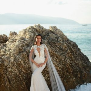 L’abito Michelle, altamente ricercato nei dettagli e nei ricami, incarna l’essenza della versatilità grazie alla sua sopragonna removibile, permettendo di trasformare il look durante il grande giorno.