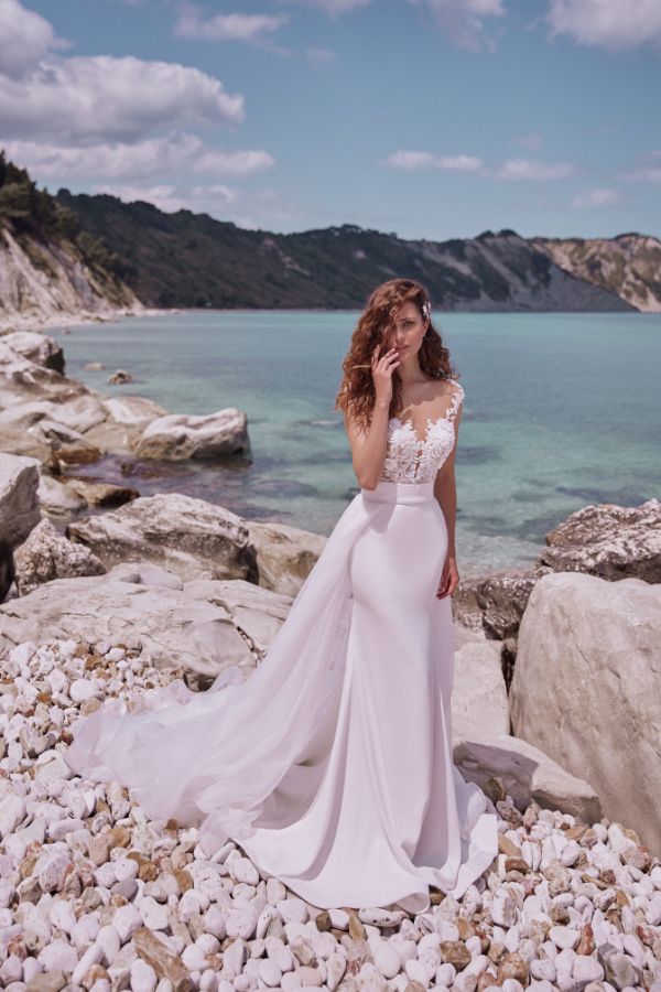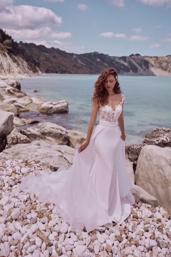 - Doppio Look. La sopragonna removibile offre la possibilità di variare l’aspetto del capo, ideale per sorprendere gli ospiti con un cambio di look dalla cerimonia al ricevimento.