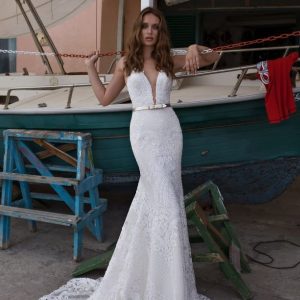 Michelle è un abito a sirena, che presenta un corpetto steccato e adornato con pizzo ricamato. Con uno scollo omerale, il corpetto è decorato da inserti illusion. Le coppe integrate offrono sostegno e comfort.