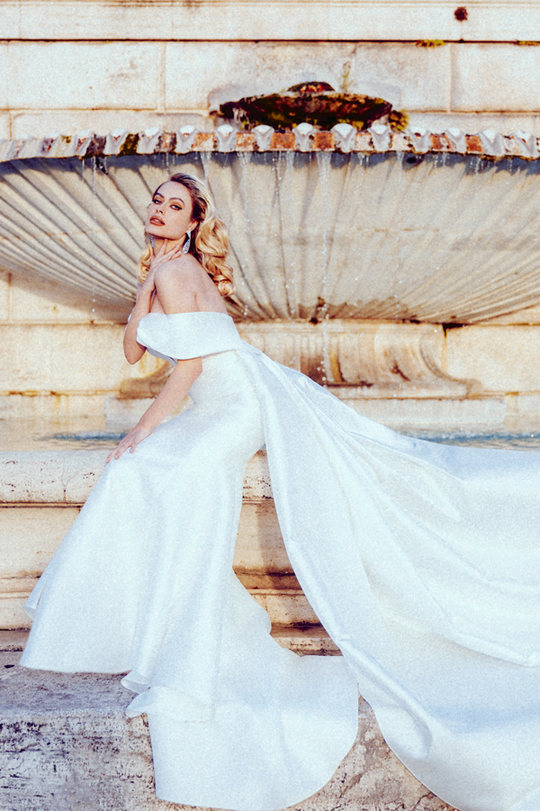 Il modello Mirella è una linea a sirena con tagli redingote realizzati in prezioso mikado di seta.