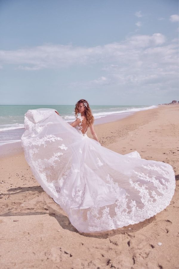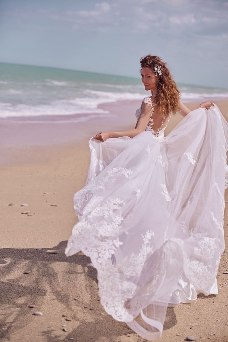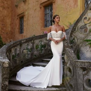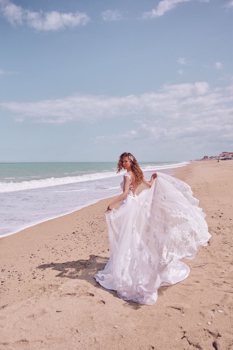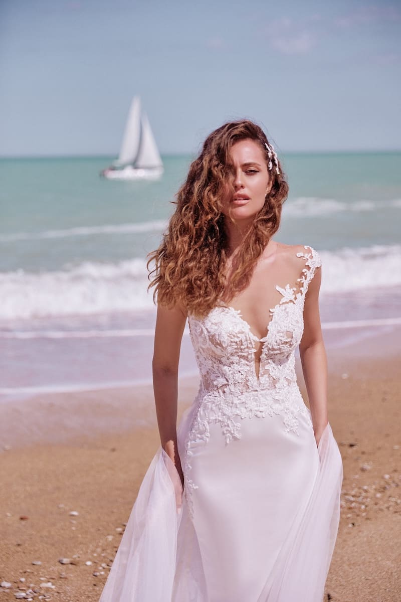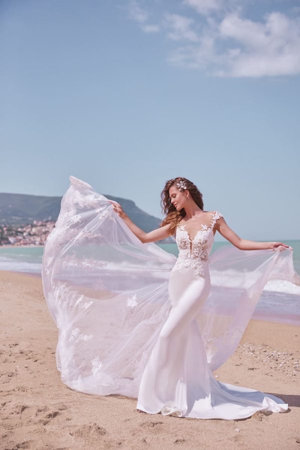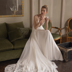 L’abito Musa è una fusione di eleganza e metamorfosi, riflettendo la libertà di una farfalla. La vera magia si svela con la sopragonna removibile in tulle, decorata con un pizzo, che sembra proprio disegnare le ali di farfalla, permettendo a chi lo indossa di trasformare il proprio look da uno spettacolare ingresso a una serata all’insegna della libertà di movimento e della sensualità.