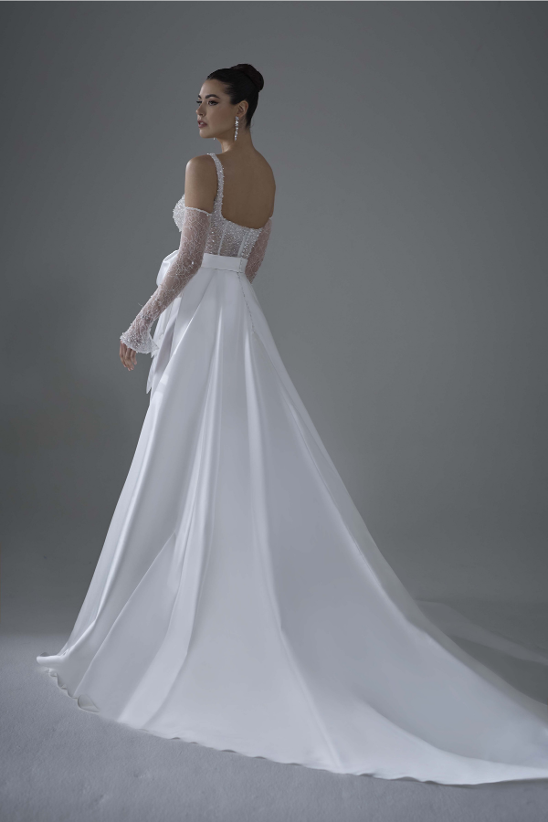 La gonna semi ampia in duchesse, liscia e strutturata, scende morbida fino a una coda lunga da cattedrale, che conferisce all’abito una portanza importante ma mai ingombrante. Il design del retro riprende la pulizia del fronte, chiudendo il capo con coerenza ed eleganza.
