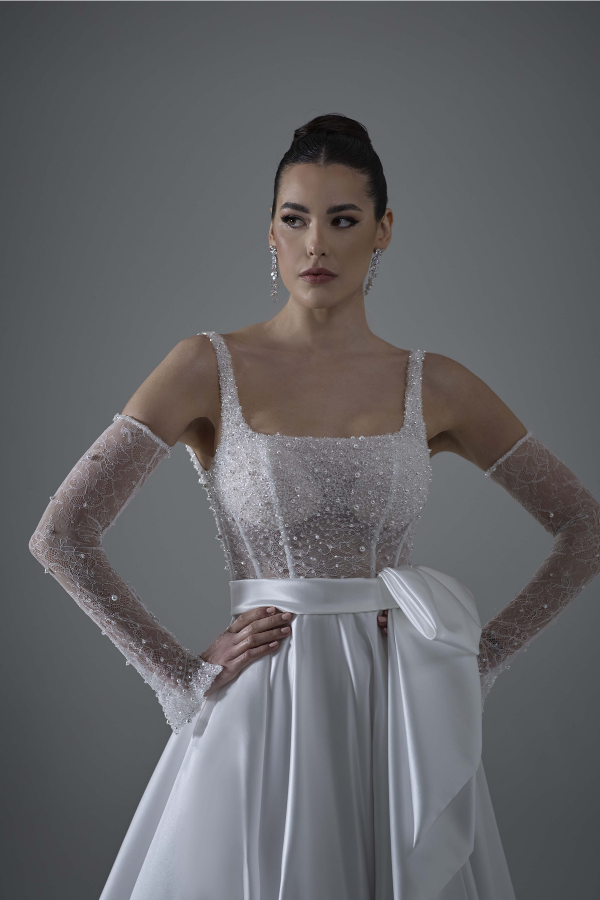 I manicotti removibili, in perfetta continuità con il ricamo del bustino, aggiungono un tocco contemporaneo e trasformabile, permettendo alla sposa di modulare il look da cerimonia a ricevimento.