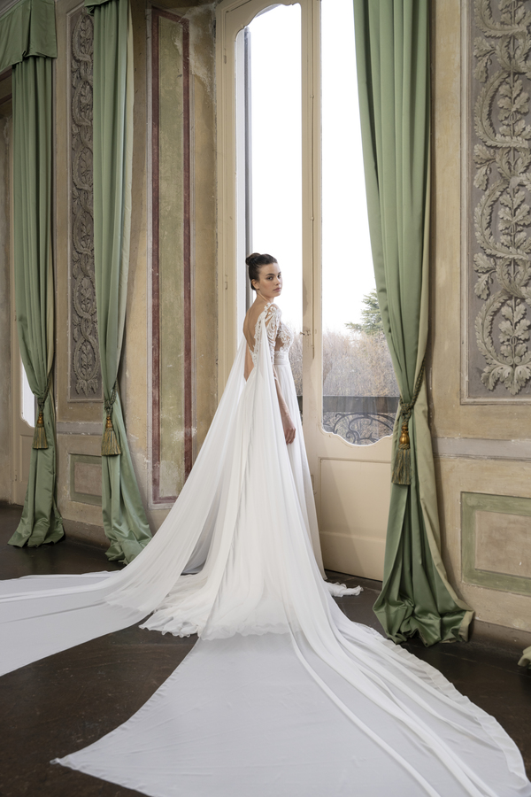 Dalle spalle cadono due lunghe ali in chiffon removibili, che conferiscono all’abito un’aura di leggerezza e romanticismo.