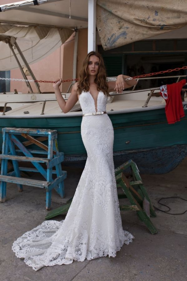 Realizzato in pizzo macramè con effetto rete, Penelope offre un look decisamente moderno. Il davanti è caratterizzato da uno scollo profondo a V in pizzo che esalta il décolleté, mentre il corpino steccato con coppe sostenitive garantisce una perfetta aderenza e sostegno. La gonna a sirena segue le curve con precisione e seduzione. Il retro culmina in una profonda e misteriosa scollatura tondeggiante.