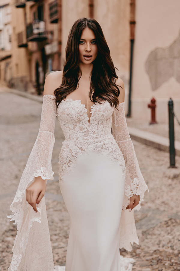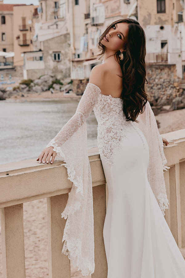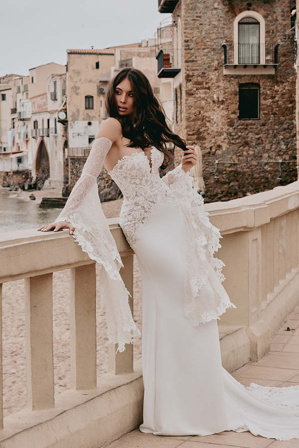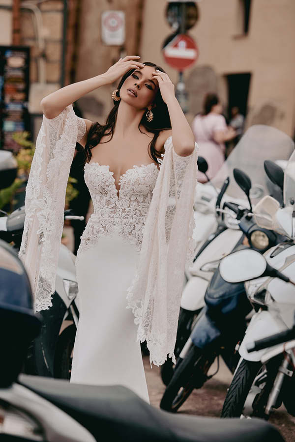 L’abito è completato da manicotti lunghi in pizzo, che scendono a creare delle ali, conferendo un tocco etereo. Perfetto per fisicità longilinee e mediterranee, questo abito è adatto per ogni stagione.