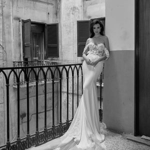 L’abito Porta Nolana è una morbida sirena in cady con un’elaborata coda ornata da medaglioni di pizzo ricamato, che decorano anche la parte superiore del corpino e dei fianchi.