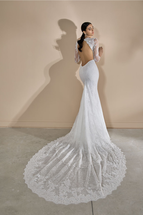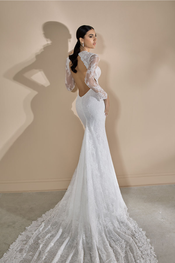 Il retro è il vero colpo di scena: una profonda scollatura ad oblò valorizza la schiena e si apre su una lunga coda in pizzo scenografico, con motivo fit and flare che segue con eleganza la figura.