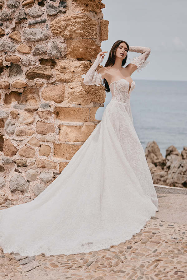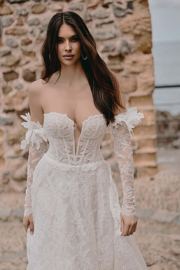 La scollatura leggermente a punta ed effetto nude look sul retro dell’abito crea un contrasto affascinante e moderno, completato dai manicotti in pizzo ricamato che riprendono il tema del corpino e donano quell’eleganza di cui ogni sposa necessita.