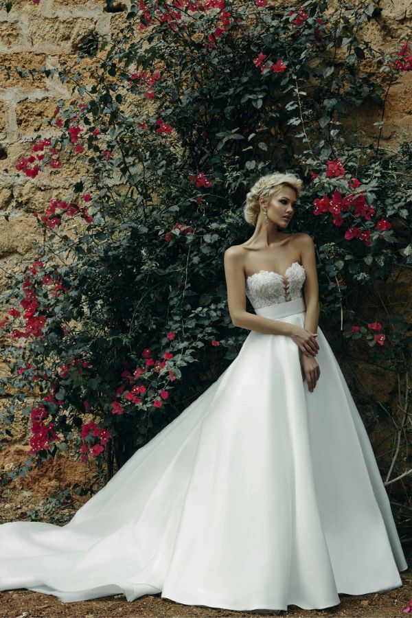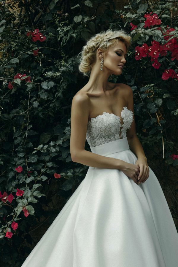 La parte superiore del corpino è caratterizzata da un profondo scollo a cuore, interamente in pizzo ricamato con intarsi di cristalli e swarovski, creando un intricato gioco di ramage floreali. Le coppe autoreggenti assicurano sostegno e vestibilità, enfatizzando il décolleté con grazia.