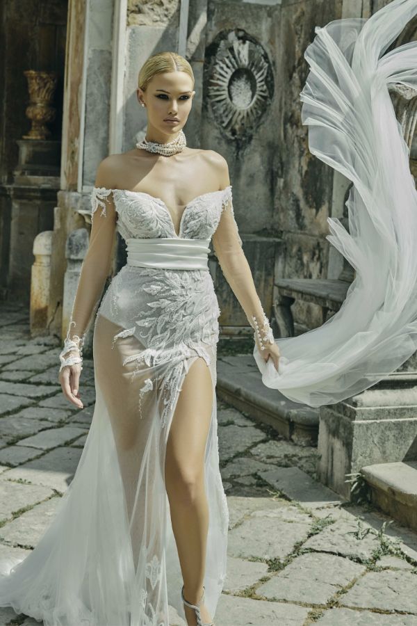 Questo abito rompe gli schemi tradizionali, offrendo una duplice funzionalità che lo rende davvero unico. Il suo sovragonna removibile permette di trasformare completamente il look durante la giornata, regalando alla sposa un’esperienza da favola. Con il sovragonna, l’abito appare regale e voluminoso, perfetto per la cerimonia; rimuovendolo, la sposa svela un abito aderente e sensuale, che incanta con la sua audacia, ideale per il ricevimento e la festa.