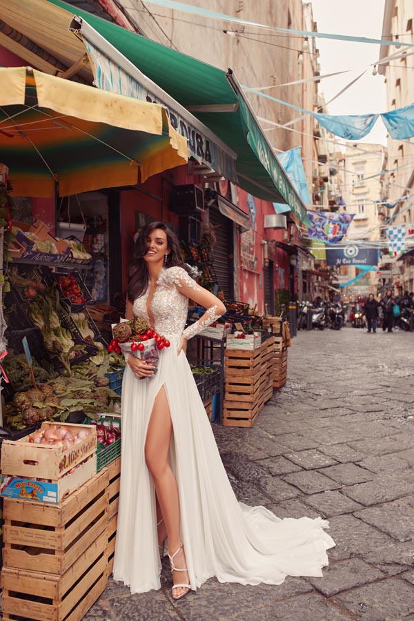 L’abito scivolato ti fa volare attraverso il giorno più bello, lasciandoti libera di essere te stessa con la leggerezza che illumina e accompagna ogni momento e movimento.